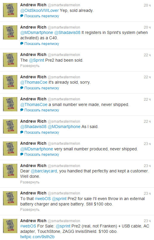 Сегодня в твиттере юзер Andrew Rich продавал за $100 интересный телефоник - Palm Pre 2 для сети североамериканского оператора Sprint (не Franken Pre). По словам продавца, после девайс регистрируется в сети оператора под именем C40. Теперь стало понятно, что скрывалось под этим обозначением. Что ж, еще одной тайной стало меньше...