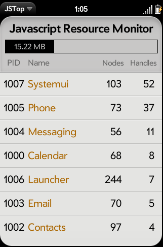 JsTop представляет собой монитор ресурсов приложений (Javascript Resource Aplication Monitor) для операционной системы webOS. С его помощью можно просматривать сведения об использовании аппаратных ресурсов (оперативной памяти) и программных ресурсов (сервисов) в режиме реального времени. Помимо этого, благодаря монитору ресурсов можно завершать приложения, кликнув по имени приложения и выбрав опцию "Kill It!" во всплывающем меню.