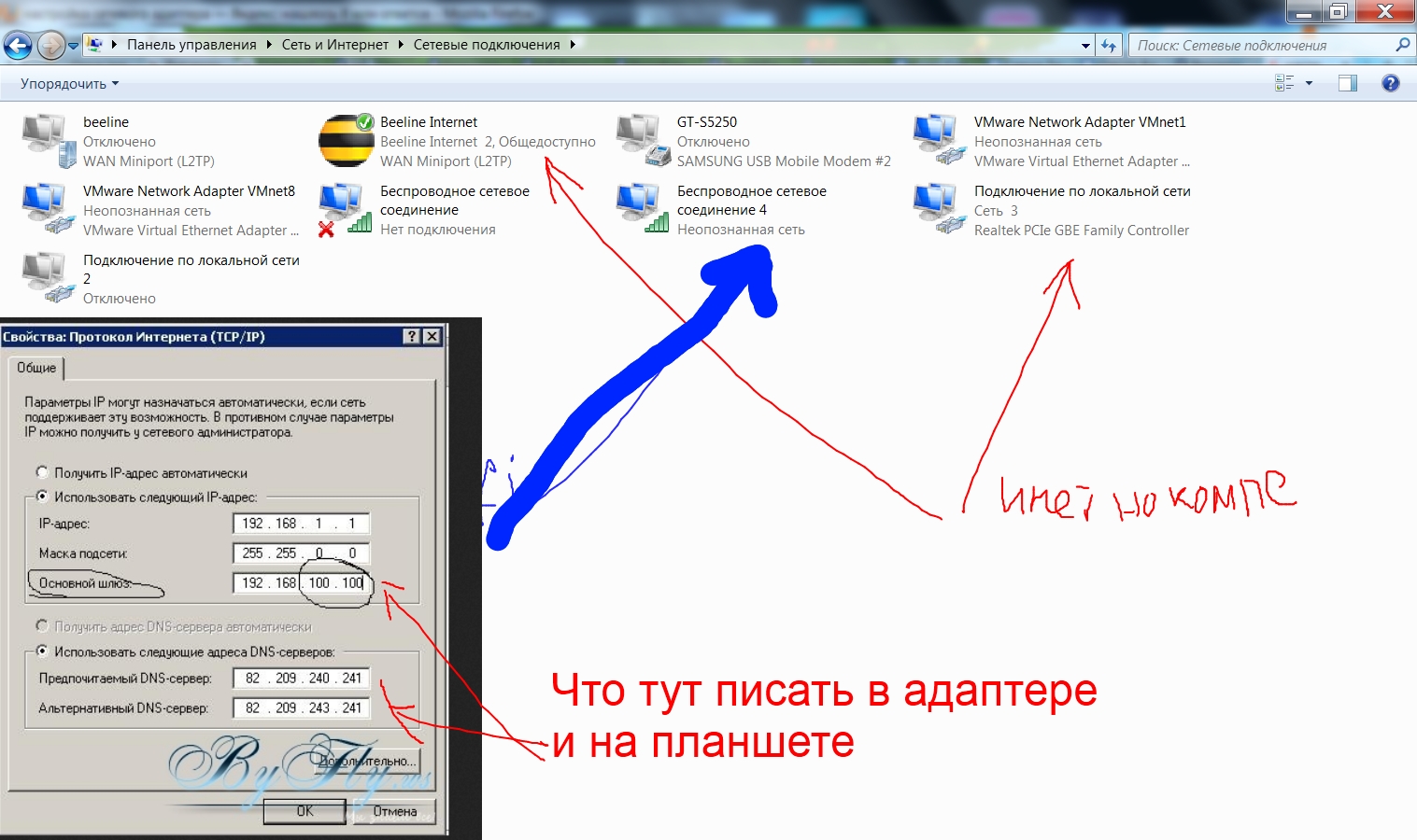 Что прописывать в полях gateway ,dns server. Шлюз -- это наверно адрес вайфай адаптера на компе,а что днс сервер заполнять. И как тогда правильно заполнить поля в настройках вайфай адаптера на компе ,что там писать в шлюзе и какой днс. Шлюзом наверно будет то что выдаёт" my ip "если в яндексе написать.
