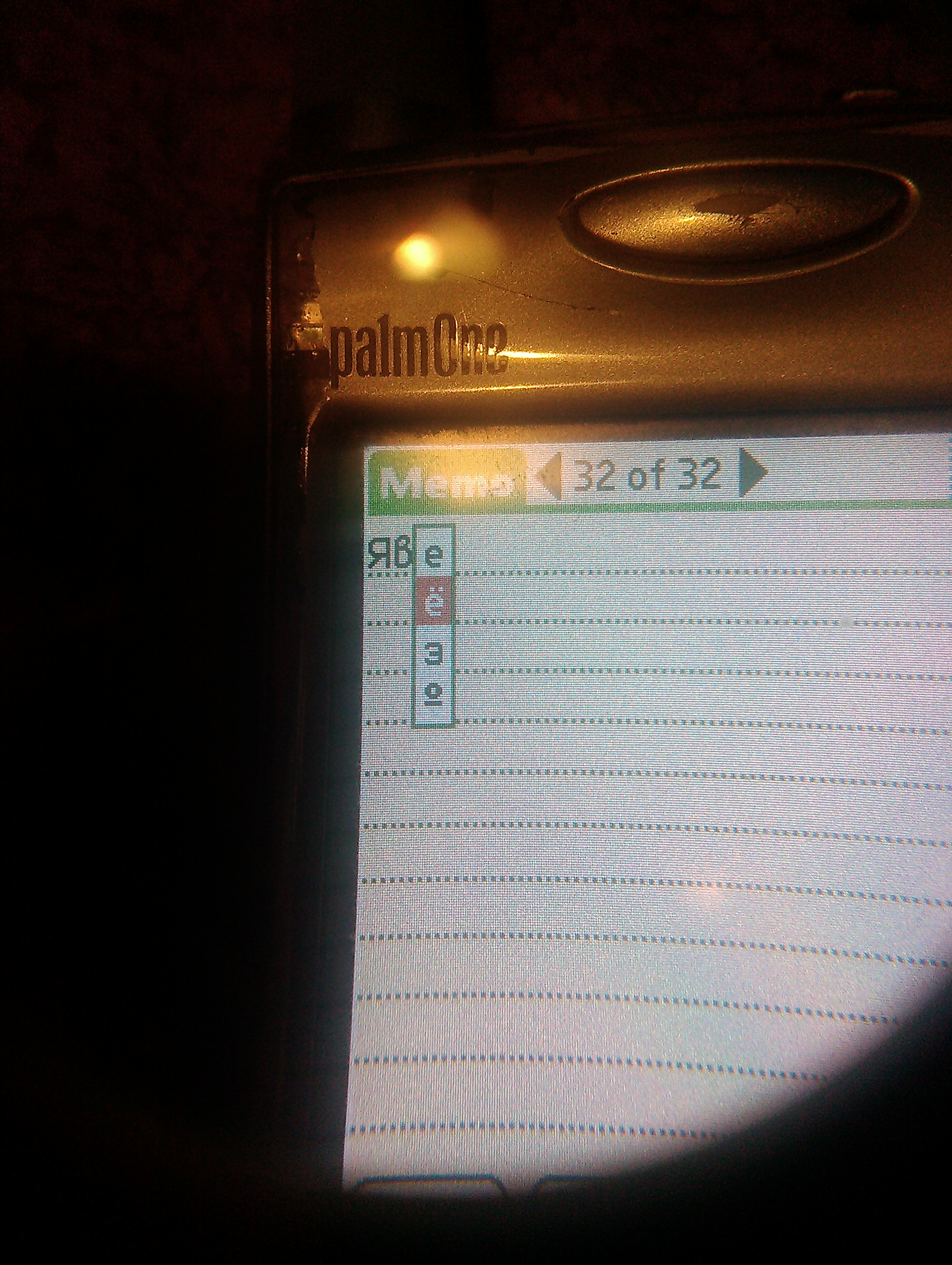 Недостающие символы кириллицы набирались так: пользователь нажимал, допустим, клавишу е. в поле для ввода печатался символ е, курсор размещался после него. далее пользователь нажимал клавишу "Alt" (на Treo она находилась справа от пробела). возле напечатанного символа е появлялось небольшое всплывающее окно с дополнительными символами ё и э, из которых можно было выбрать нужный с помощью клавиш курсора или последовательного нажатия на Alt. В аттаче - моя попытка это запечатлеть.