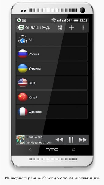 DAMP - Очень удобный и относительно простой плеер, который помимо аудио поддерживает также воспроизведение видео и онлайн трансляции радиостанций разных стран мира (БОЛЕЕ 40,000 станций). Так же вы имеете возможность абсолютно бесплатно прослушивать, просматривать и загружать себе на телефон любые аудио и видео.