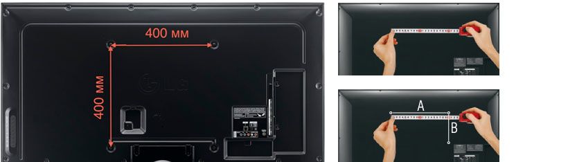 Можно измерить необходимые расстояния между крепежными отверстиями на задней стенке телевизора рулеткой.