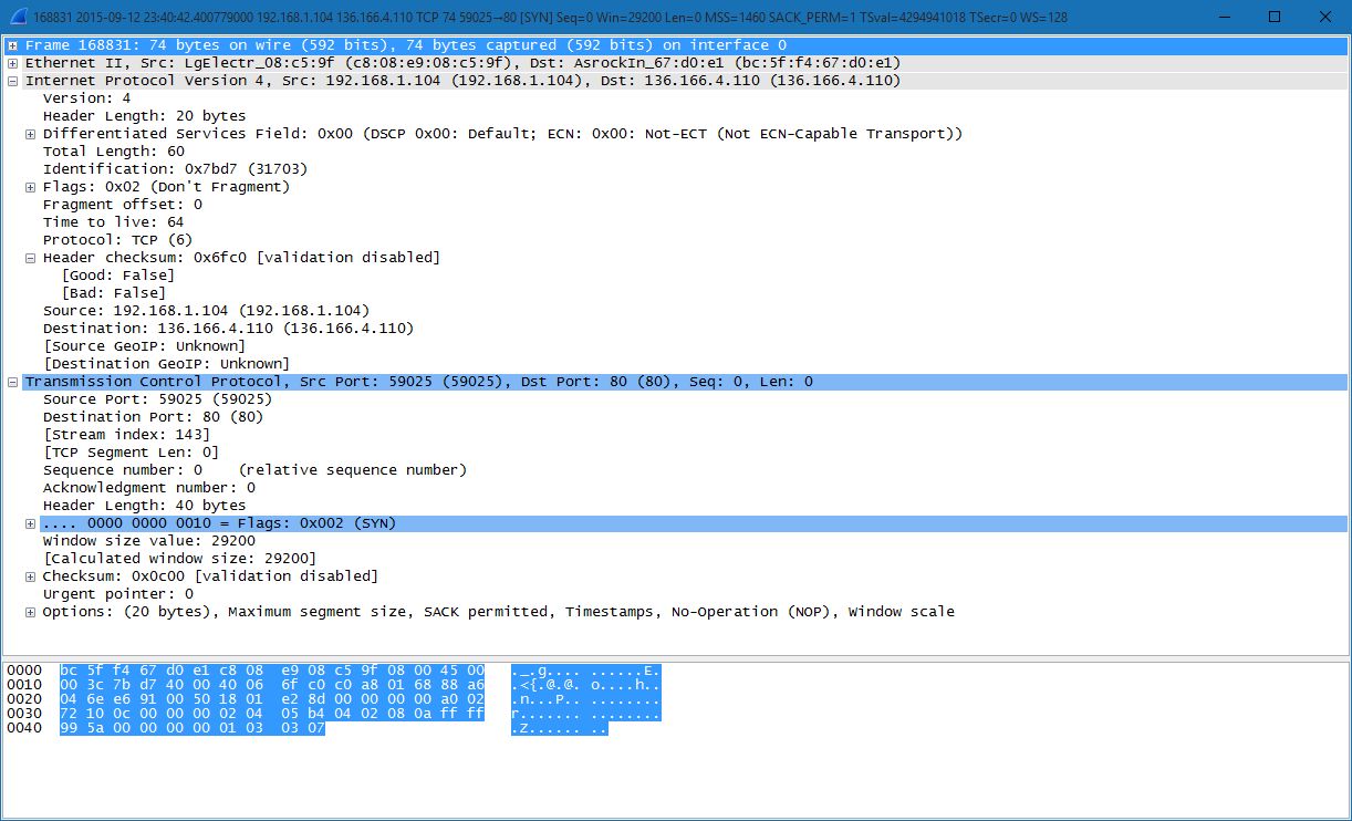 I only found a syn tcp packet.. : bc5ff467d0e1c808e908c59f08004500003c7bd7400040066fc0c0a8016888a6046ee69100501801e28d00000000a00272100c000000020405b40402080affff995a0000000001030307