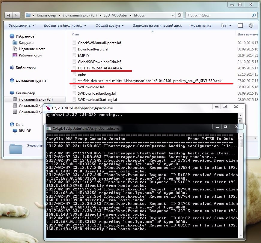 Скачал архив по ссылке с 1 поста. Заменил по инструкции IP адреса на свой. В папке заготовка нашел нужную мне версию ответа и скопировал в htdocs. Так же туда положил файл ПО для этого ответа. Запустил 2 файла. На ТВ в разделе сеть заменил DNS на адрес ПК (ТВ и ПК в одной сети (IP статика), маске подсети и на одном роутере. Лишнее ПО типа скайпа и т.д. на ПК (Win7) не включено, C:\LgDTVUpDater добавлен в исключения в NOD32, так же разрешено в брандмауэре). При поиске обновлений на ТВ пишет - Обновлений не найдено. Куда копать? Где косячу?(