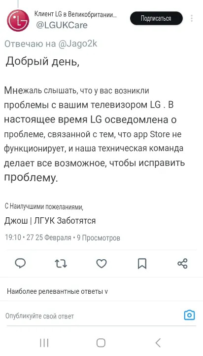 У меня телевизор LG 50NANO76, после обновления прошивки перестало работать приложение Apps, которое отвечает за установку и обновление приложений.