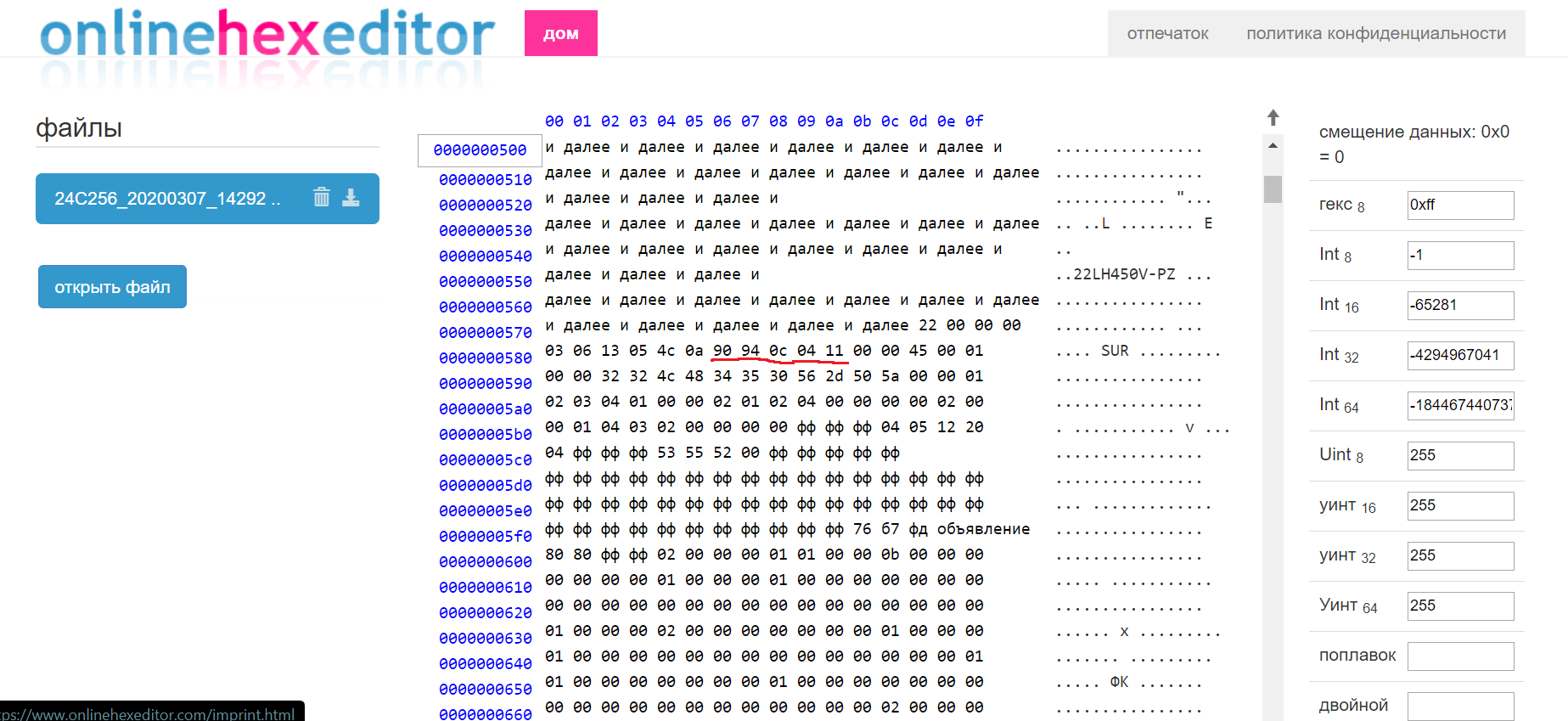 И да я понял (спасибо тебе) что число должно быть 9228. Меня интересует в шестнадцатиричной системе 24 0С. Но я не программист. У меня на телевизоре число 1036 это шестнадцатиричной системе оно представленно 3 цифрами зто - 40С. Да я считал файл Bin. с телевизора, нашёл похожее значение 94 0С 04 (скриншот я прикладываю часть строки 530 полностью файл Bin я выкладывал ранее) возможно дело в меньшем бите он всегда идёт впереди. Тогда всё соответствует, нужно просто вместо 0С 04 подставить 94 0С 24. или 24 0С 04 Где правильно? может быть вообще не в этой строчке нужно менять знаки. Ещё раз повторюсь я не прграммист и ничего в этом не понимаю, поэтому я и спросил совета. Возможно кто-то уже прошивал такие марки телевизоров. Или откликнется просто специалист в этом вопросе.