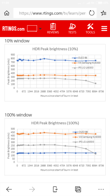 Всего было протестировано 27 телевизоров. Так же, как и на rtings, 10 минут статики, проверка на сером, максимально яркий режим.
