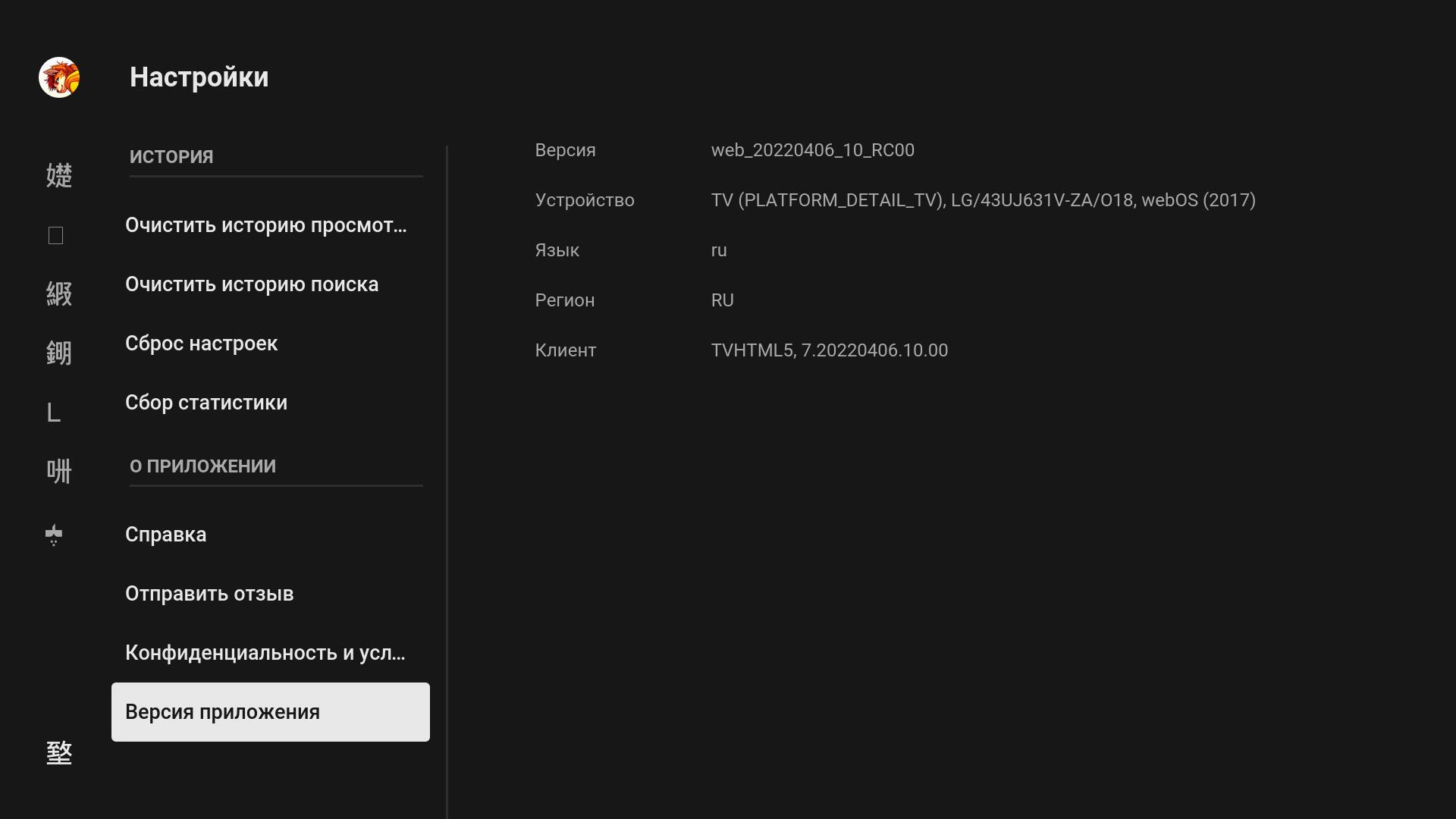 CatRiX писал(а):Смена страны тоже не помогла. Пробовал даже с VPN заходить в приложение - ничего. На двух других телевизорах всё нормально.