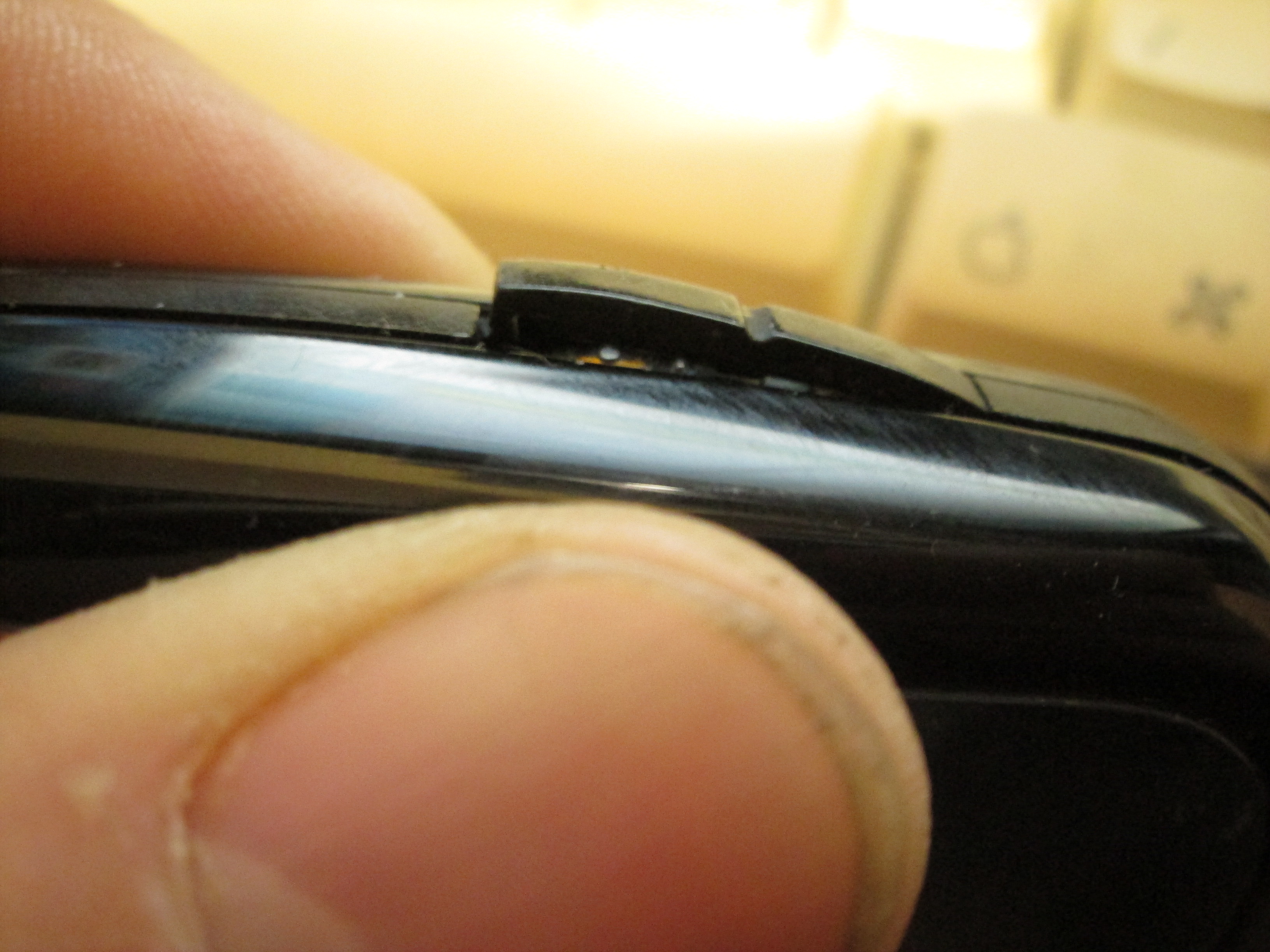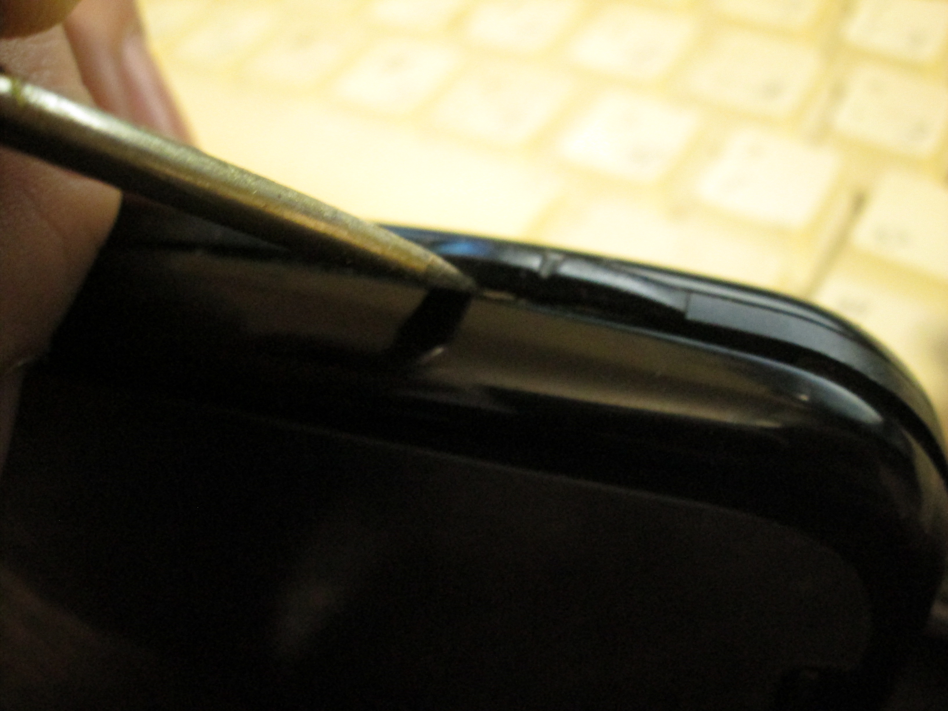 вставляешь тонкую "-" отвертку или пилочку со стороны экрана к самому нижнему краю кнопки убавления громкости и выдавливаешь, не бойся не сломается с нижней стороны защелка. А вот с верхней длинная планка. Придерживай качалку, может вылететь будешь искать :-)