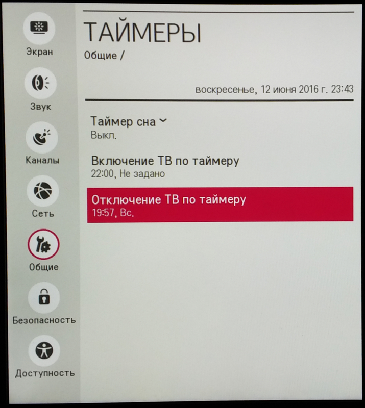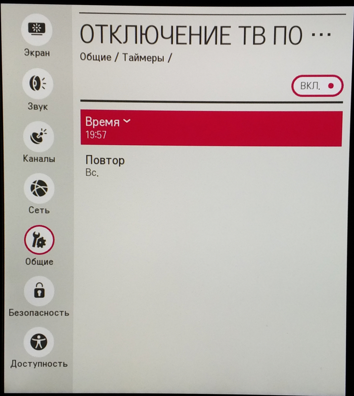Для автоматического отключение питания ТВ зайдите в: [Настройки] ? [Общие] ? [Таймеры] ? [Отключение ТВ по таймеру]