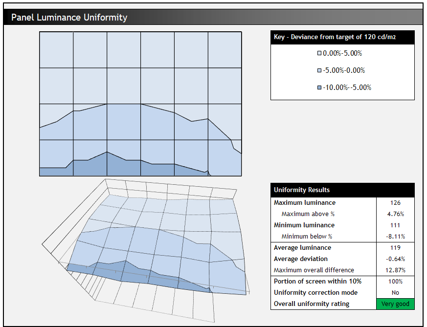 Мы хотели проверить, насколько равномерны яркость и цветовая температура по всему экрану, тем более что некоторые пользователи сообщали о проблемах с цветными оттенками на своих экранах, чаще всего с голубоватым оттенком по краям. Измерения проводились в 36 точках поперек панели на чисто белом фоне. Измерения проводились с использованием колориметра X-rite i1 Display Pro с центральной точкой на экране, откалиброванной на 120 кд/м 2. На приведенной ниже диаграмме однородности показана разница в процентах между измерениями, записанными в каждой точке экрана, по сравнению с центральной контрольной точкой.