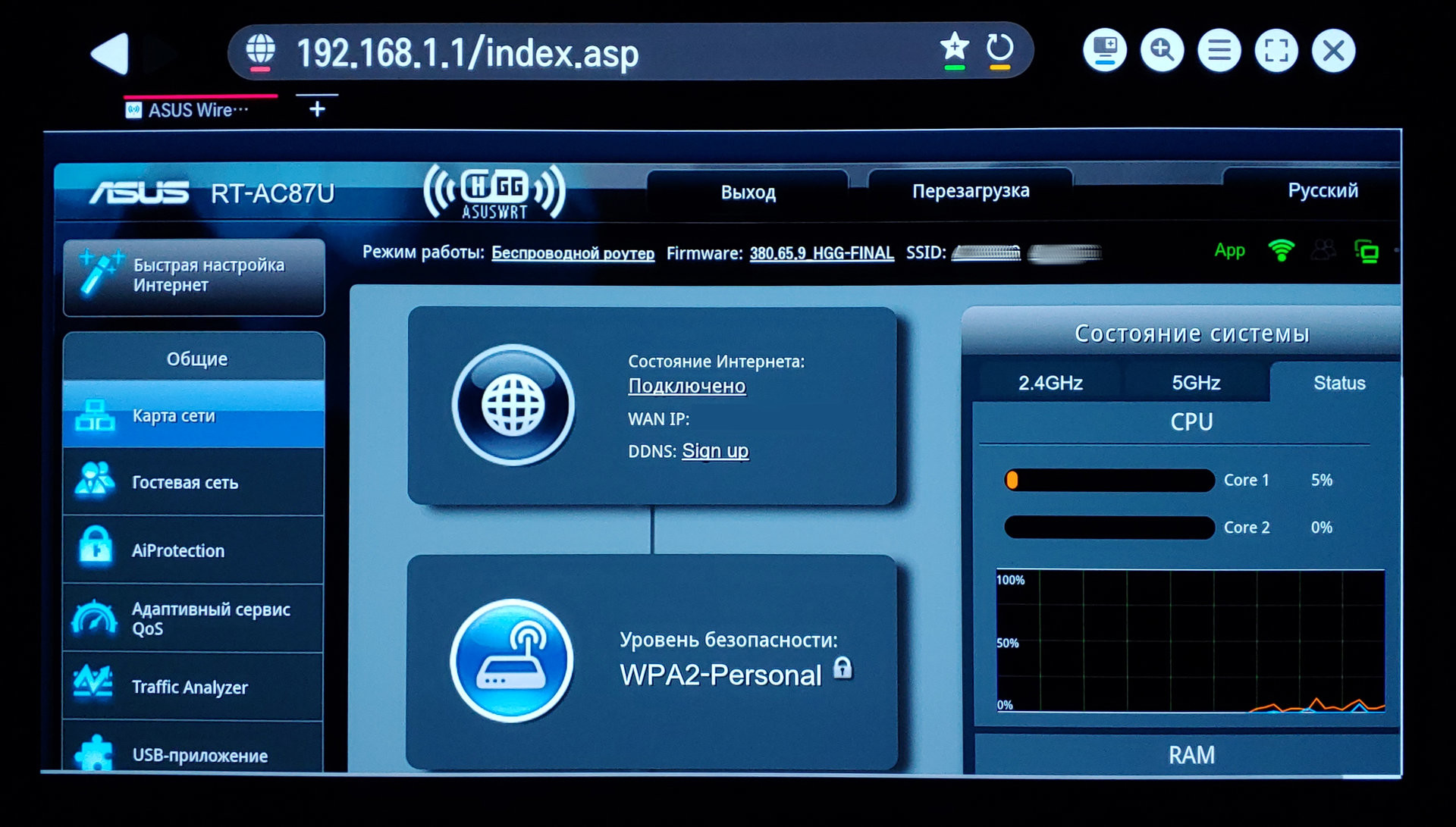 Заходит на роутер ASUS через браузер ТВ:
