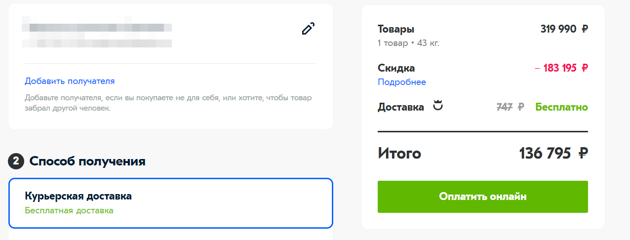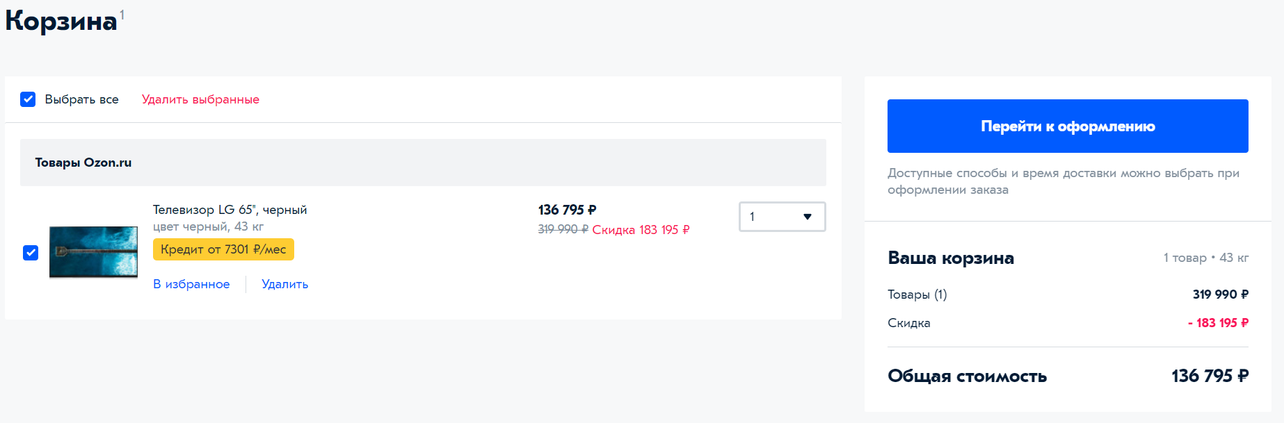 Меня лично данное приобретение не интересует (из-за диагонали), поэтому окончательное разрешение ситуации после оформления заказа я проверить не могу (до предложения произвести оплату все соответствует анонсу, и даже изменяется на 126 т. р., если ставлю галку об использовании имеющихся 10000 баллов на счете). Прямо сейчас (проверено в 11:35 по МСК) опятьnarpol писал(а):я не могу объяснить, почему Озон уже в который раз как-то эксклюзивно/выборочно предлагает цены на OLED ТВ, но если заинтересует/заинтересовало, можно (попробовать) оформить с моего акка заказ в Ваш адрес (предупреждения тут narpol @ Экономим при покупке телевизора LG (акции, скидки, бонусы))
