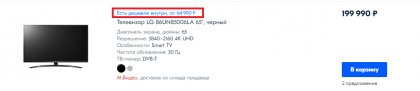 Лежит/висит в корзине, ждет онлайн-оплаты, кто хочет рискнуть - можем попробовать заказать в Ваш адрес (что придет по диагонали в реале - я не в курсе Анализировать пометку 65" и вес бессмысленно, т.к. они такие же, как и для аналога в М-Видео по втрое больщей цене)