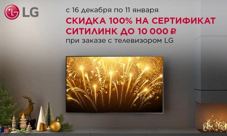 До 11 января вы можете приобрести телевизор LG и получить подарочный сертификат на скидку до 10000 руб.. Для этого добавьте нужный тв в корзину и соответствующий сертификат. Размер скидки будет зависеть от стоимости телевизоров. Имеются сертификаты номиналами 3000 рублей, 5000 руб., 7000 руб. и 10000 руб. Вот например, телевизор LG 43UN74006LA, 43", Ultra HD 4K (https://www.citilink.ru/catalog/audio_a ... v/1371797/) + сертификат на 3000 руб. обойдётся в 30810 рублей вместо 35990 рублей. Обратите внимание, что в зависимости от города цены на телевизоры отличаются!