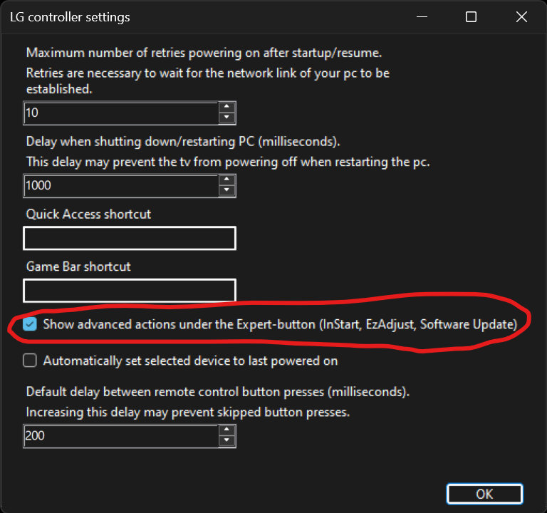 ColorControl, найдите на закладке "LG Controller" свой телевизор (один раз на телике нужно будет подтвердить подключение). Далее нужно в включить отображение доступа к расширенным действиям. Нажмите кнопку Settings... -> Settings.