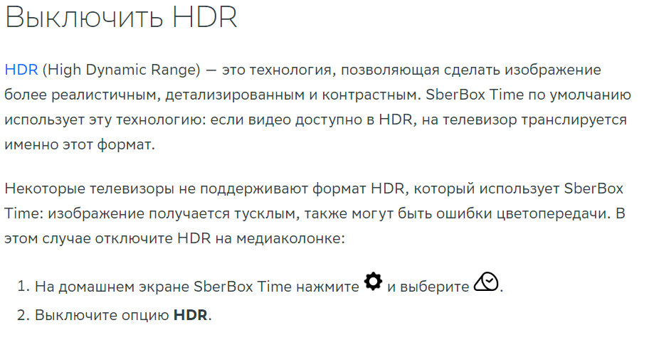 Некоторые телевизоры не поддерживают формат HDR, который использует SberBox Time: изображение получается тусклым, также могут быть ошибки цветопередачи. В этом случае отключите HDR: