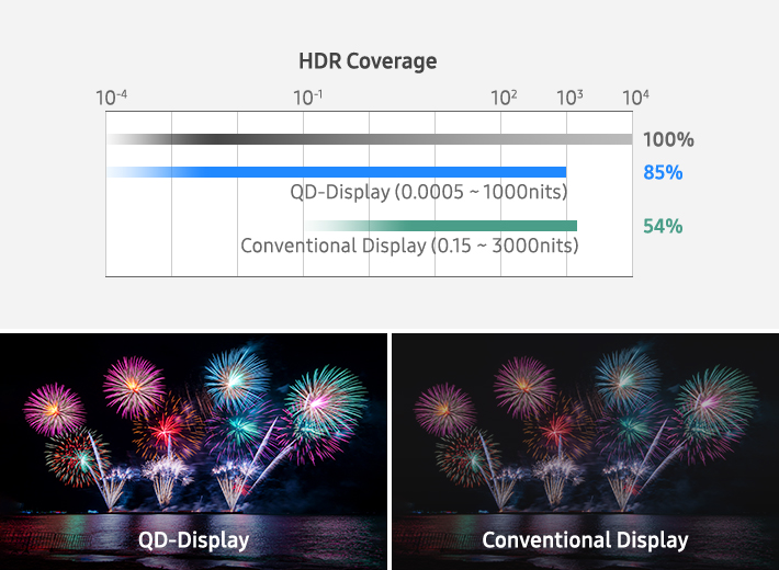 Когда вы воспринимаете яркость дисплея, вы видите не только фактическую физическую яркость дисплея, но также выразительность черного и насыщенность цвета. Даже при одинаковой яркости контраст выглядит по-разному в зависимости от контраста фона. Чем лучше дисплей отображает черный цвет, тем ярче он выглядит. Кроме того, яркость зависит от цветотипа. Чем выше насыщенность одного цвета, тем ярче он выглядит. Но превосходное отображение черного цвета на QD-дисплее и более широкий диапазон цветов делают дисплей ярче, чем он есть на самом деле.