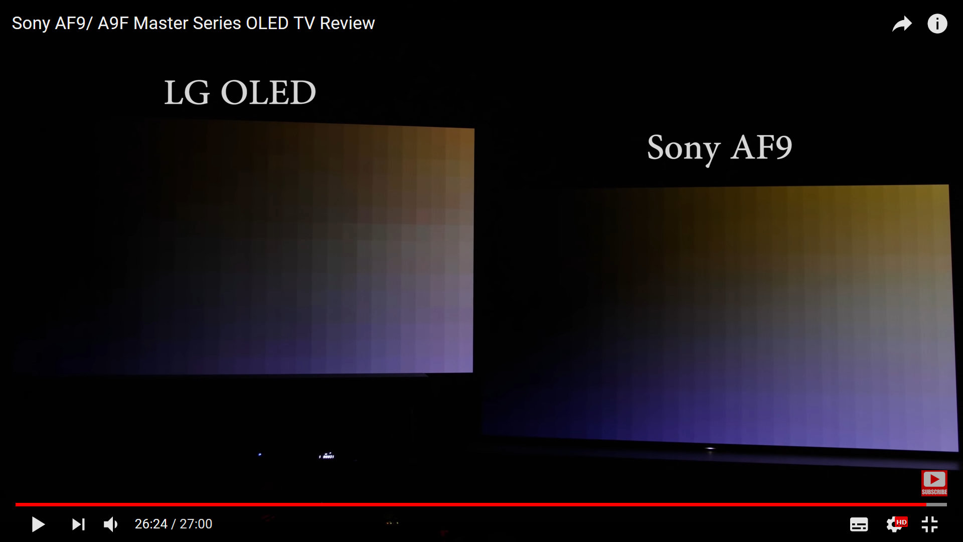 Отметил, что в тенях отображение градаций на прошлых моделях было лучше. Возможно это связано с изменениями алгоритмов тон. мапинга и вытягиванием из ТВ б'ольшей яркости. Но в целом работа с градациями всё равно на высоком уровне и по словам Винса лучше чем у конкурентов. Далее кадр со сравнением тестового паттерна с LG.