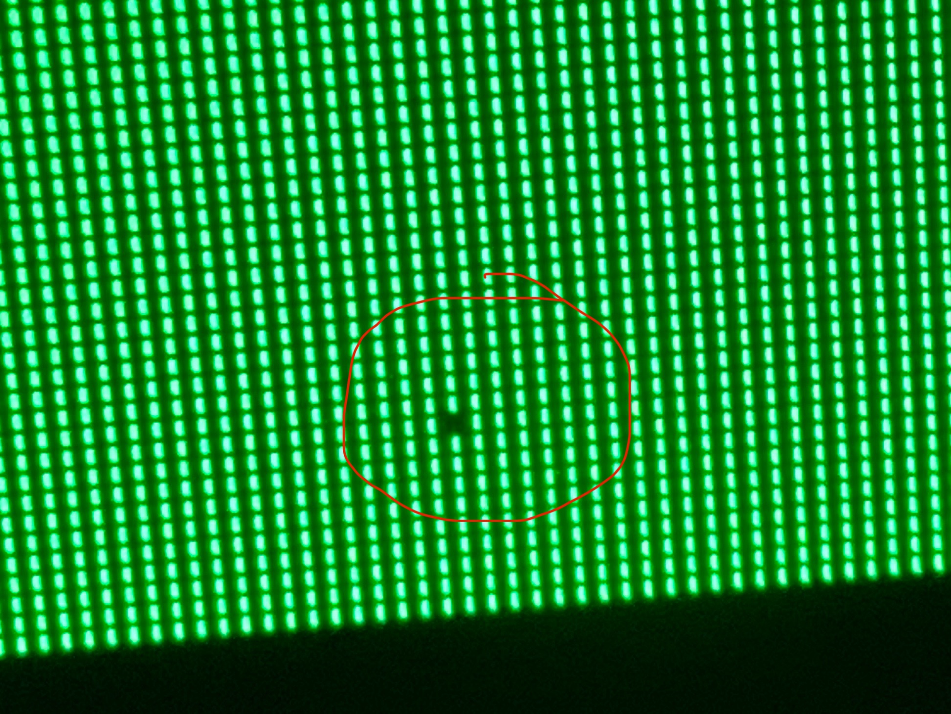 а именно (в т. ч. более укрупненная макросъемка или пояснения в одной ли точке это происходит): Есть ли эта темная точка на заливках основными цветами (RGB) и на белом? Пока похоже, что речь идет о сбойном зеленом субпикселе [он же участвует в создании и желтого, и сине-зеленого (=аквамарин) цвета]