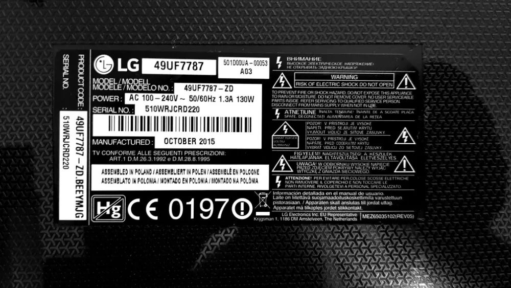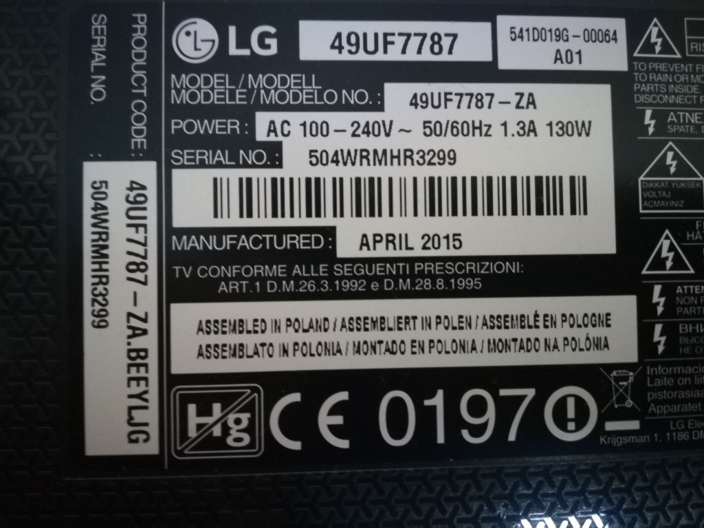borza писал(а):Maybe I could buy a mainboard from a 49UF7787-ZD, but I do not know if it matches the ZA.The firmware is different and from what I understand through my internet searches it seems that the panels are different.The owner with the ZD card does not know how to dismantle the TV and send me a picture of the mainboard label, I only have the picture with the full TV label.Someone who has access to LG parts manual can see if the mainboards are identical.Probably not, but could it still work properly?