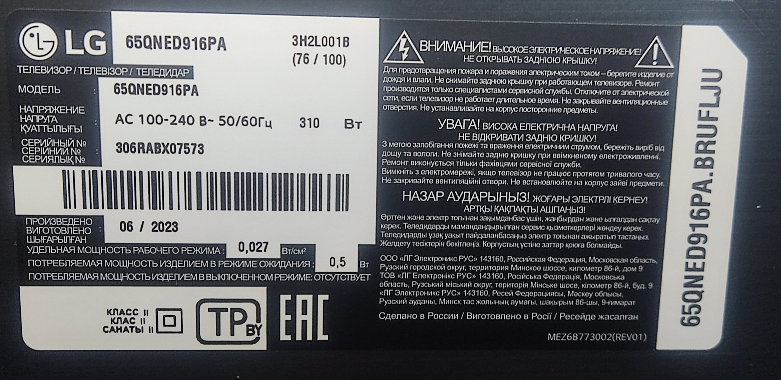 Приобрел телевизор с маркетплейса 65QNED916PA сборка Россия, если верить стикеру на задней панели.