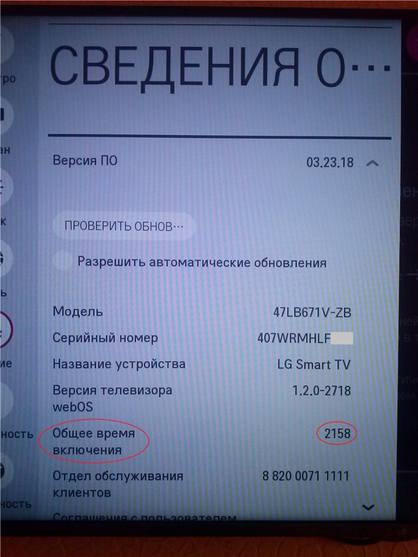 В предыдущем телике я не заходила в раздел "сведения о телевизоре" и не знаю ни версию его ПО,ни общее время включения.