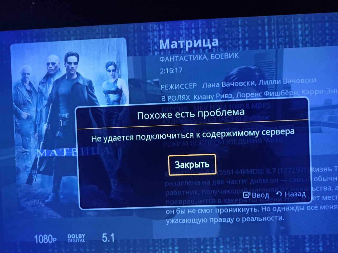 Сам фильм полностью обнаруживается и подтягивает данные, но при попытке воспроизведения появляется вот это.