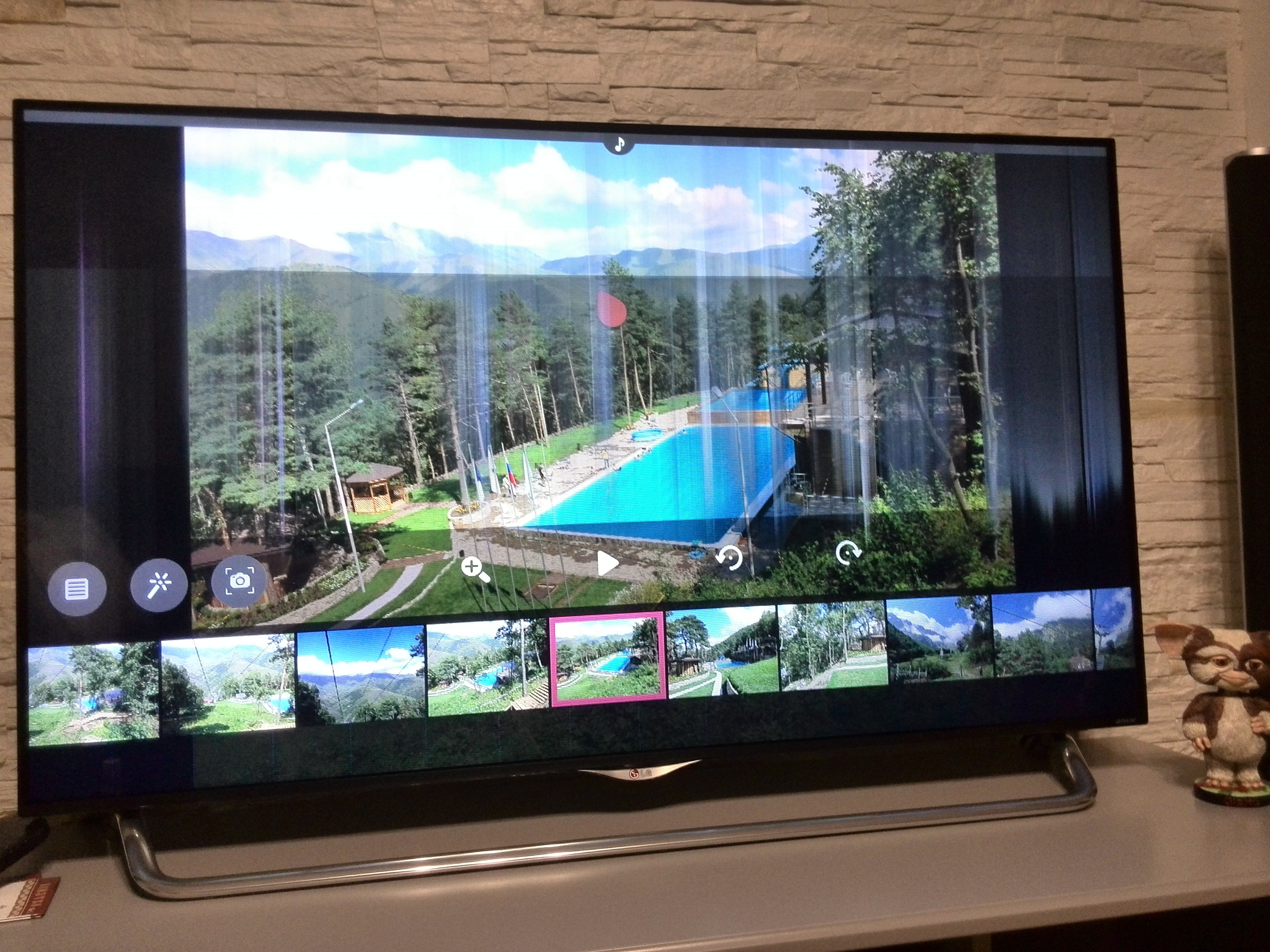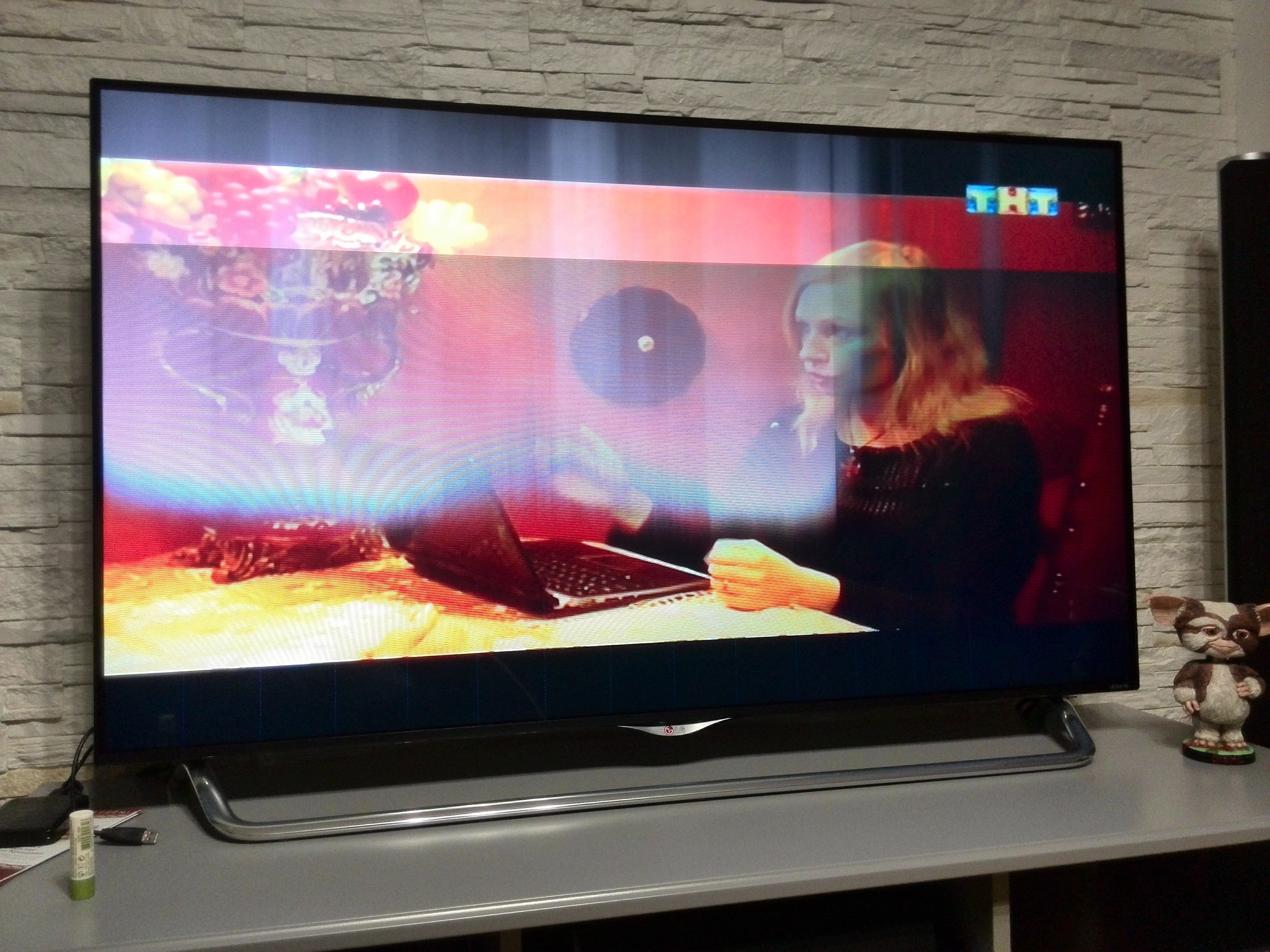 Пользуюсь телевизор 55UB850V. Столкнулся вот с такой проблемой - периодически с интервалом по 2 секунды картинка меняется от нормальной к с глюками (на фото). Глюки начинаются с момента включения и в не зависимости от того, что делаешь с телевизором просмотр тв, фильмов с флешки или работе в интернете происходит одно и то же - глючит экран. Недавно автоматически обновилась ПО до 5.00.20, я предположил, что это может быть проблема с ней или с не корректной установкой. Скачал ПО 5.00.25, установил, не помогло.