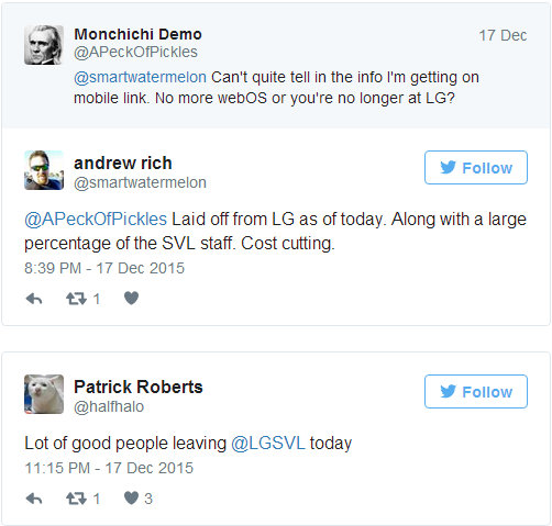 LG сокращает штат своих разработчиков в офисе компании, расположенном в Кремниевой Долине, в котором работала команда по разработке webOS. Компания сократила штат примерно на 20 сотрудников.