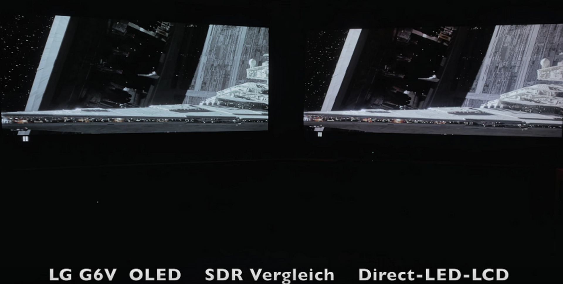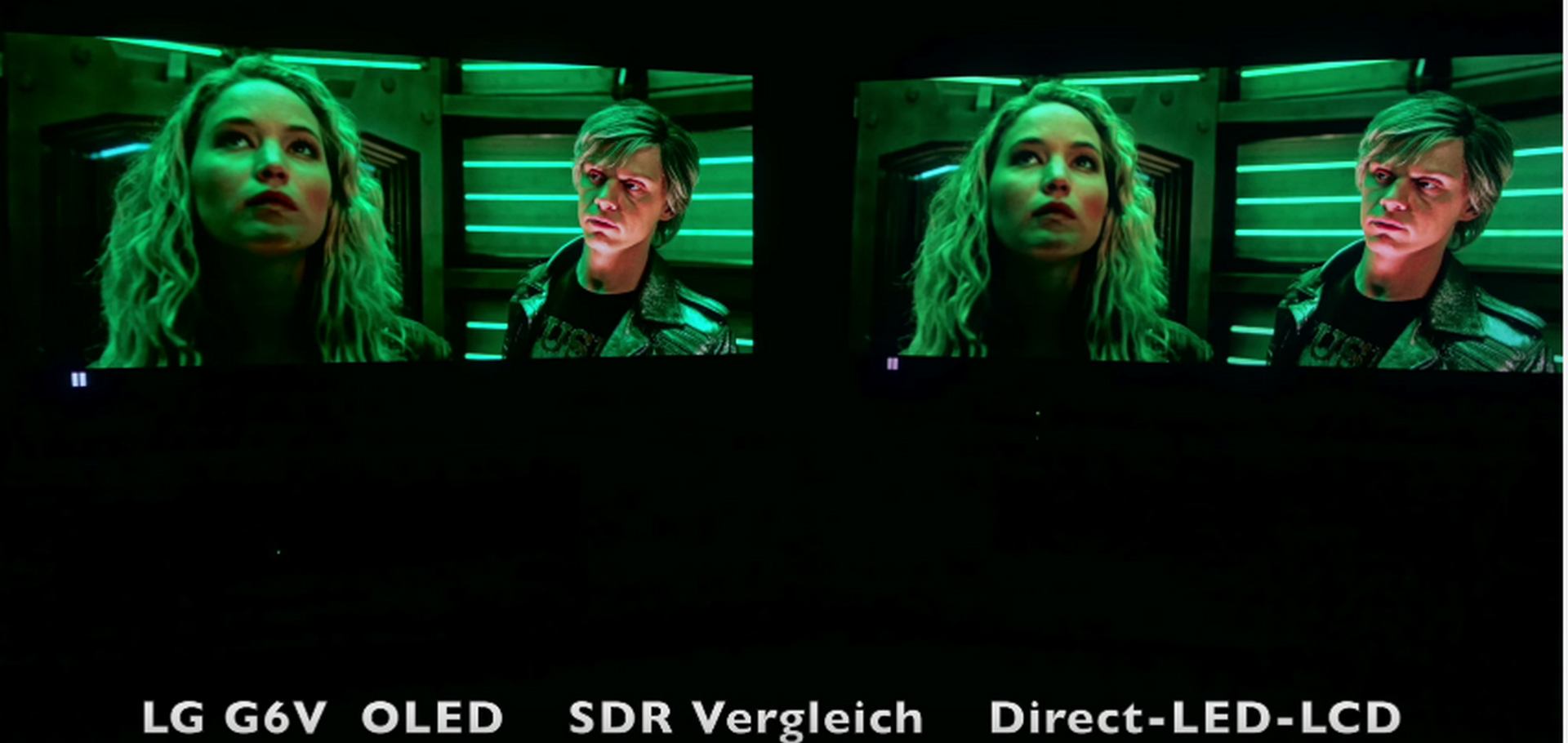 В обычном (SDR) режиме Панни не сильно отстает (а в светлых сценах и полностью идентичен). Можно, впрочем заметить, что на олед любые мелкие детали (звезды, блики поверхностей, источники освещения) выглядят ярче, что понятно в силу особенностей технологии: