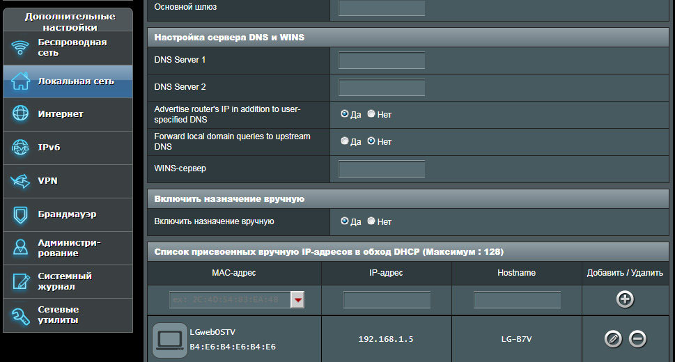 Пример прописывания статического IP в роутере ASUS: