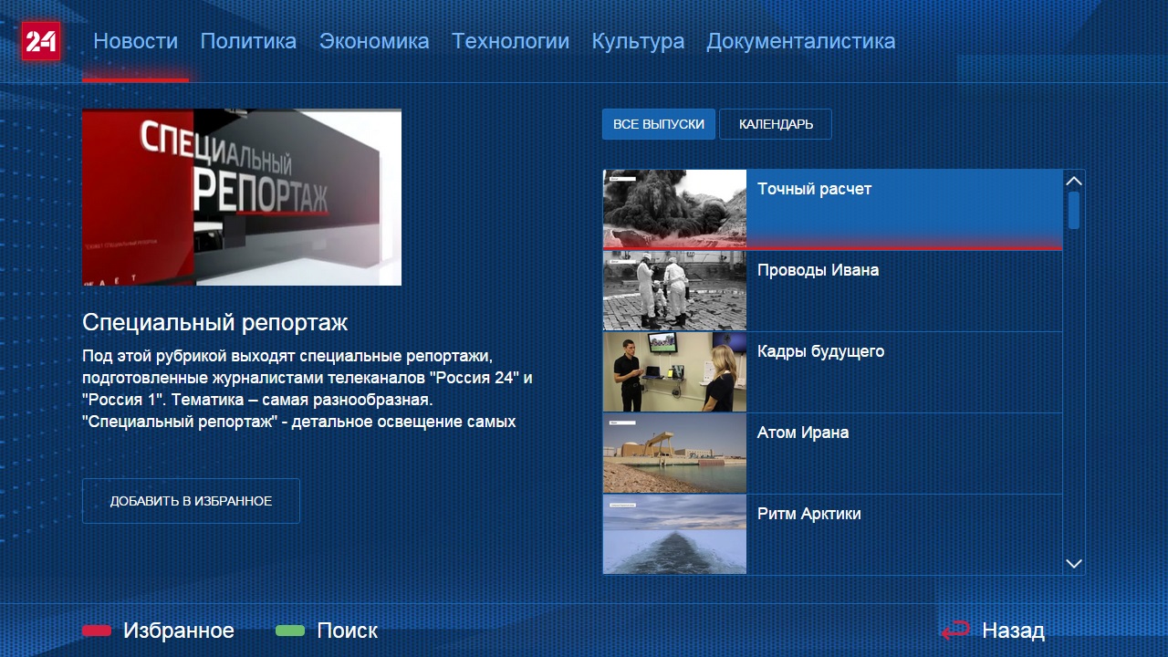 Установив его, пользователи смогут посмотреть выпуски международных новостей и новостей регионов России, новости политики, культуры, технологий и спорта. Видео сгруппировано по тематическим рубрикам: новости, политика, экономика (включая аналитику и интервью с представителями российской и мировой политических элит), технологии, а также культура и документальные фильмы.