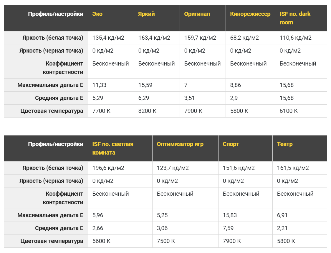 Мы более внимательно изучили эти настройки с помощью калибратора i1 Display Pro и приложения под названием DisplayCAL. По порядку это: Eco, Vivid, Original, Filmmaker, IFS Expert Dark Room, ISF Expert Bright Room, Game Optimized, Sports, Theater. Из полученных значений в таблице показаны самые высокие значения яркости, уровня черного, истинного коэффициента контрастности, цветовой температуры и дельты E. Последний представляет собой числовое значение, определяющее расстояние между двумя разными цветами в цветовой системе; чем меньше значение дельты E для данного цвета, тем оно ближе к эталонному (sRGB), т. е. тем лучше.