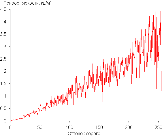 Для оценки характера роста яркости авторы обзора измерили яркость 256 оттенков серого (от 0, 0, 0 до 255, 255, 255) при выборе профиля Стандартный. График ниже показывает прирост (не абсолютное значение! ) яркости между соседними полутонами: