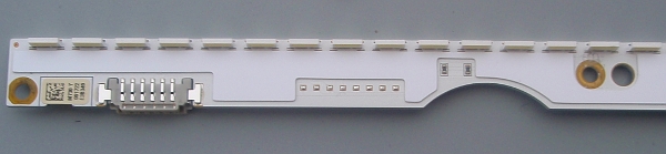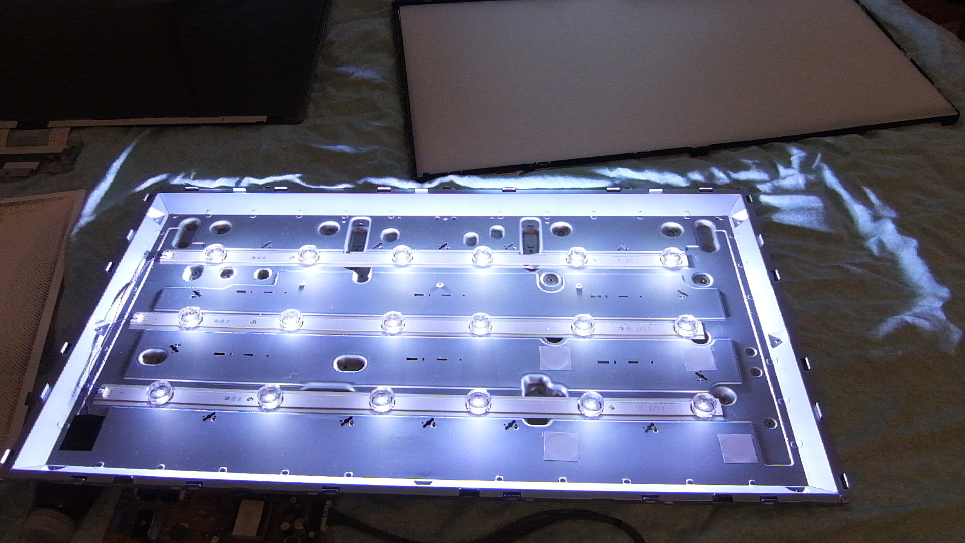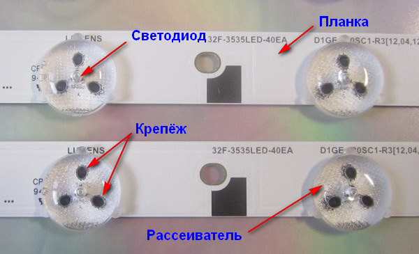 Перед нами фрагмент пластины подсветки. Сами светодиоды расположены внутри своеобразных "пуговок", которые являются рассеивателем, для более равномерного распределения светового потока, излучаемого светодиодом. На пластину нанесён проводник и изолятор, как правило - светодиоды подключены последовательно в приделах одной планки и выход из строя хотя бы одного приводит к тому, что вся планка перестаёт светиться. Можно ли их легко заменить обычными светодиодами из ленты? Нет, нельзя.