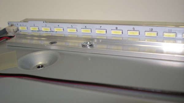 Вот так расположены светодиодные планки внутри контейнера матрицы, если её саму и все внешние рассеиватели - снять. Как видно из картинки, расстояние между светодиодами составляет около 8-12 см (в зависимости от типа пластины), поэтому хороший рассеиватель просто необходим, иначе никакого равномерного освещения не будет, этим обусловлена большая, по сравнению с типом Edge LED, толщина контейнера матрицы, а значит - и всего телевизора.
