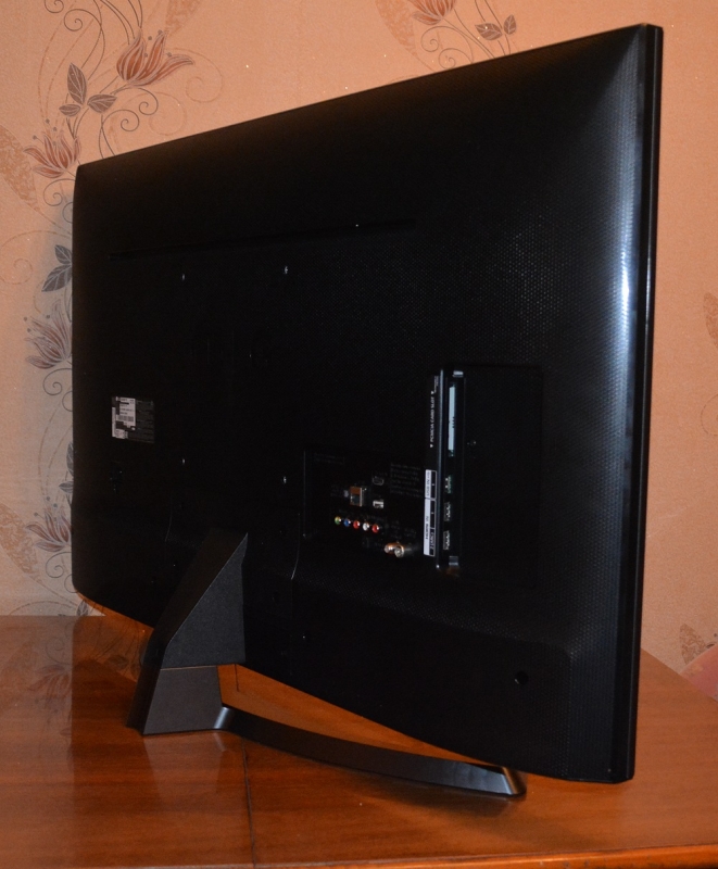 Немного удивил способ крепления ноги на телевизоре. Под ножку имеется специальное углубление в корпусе, благодаря которому ножка не выпирает из задней плоскости корпуса и находится с ним в один уровень. Изначально это углубление закрыто крышкой на защелках. Если телевизор вешается на стену - место крепления ножки можно снова закрыть этой же крышкой. Решение удачное и продуманное. Так вот телевизор смотрится с ножкой: