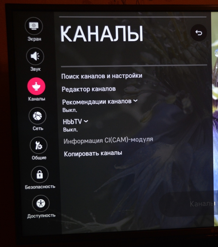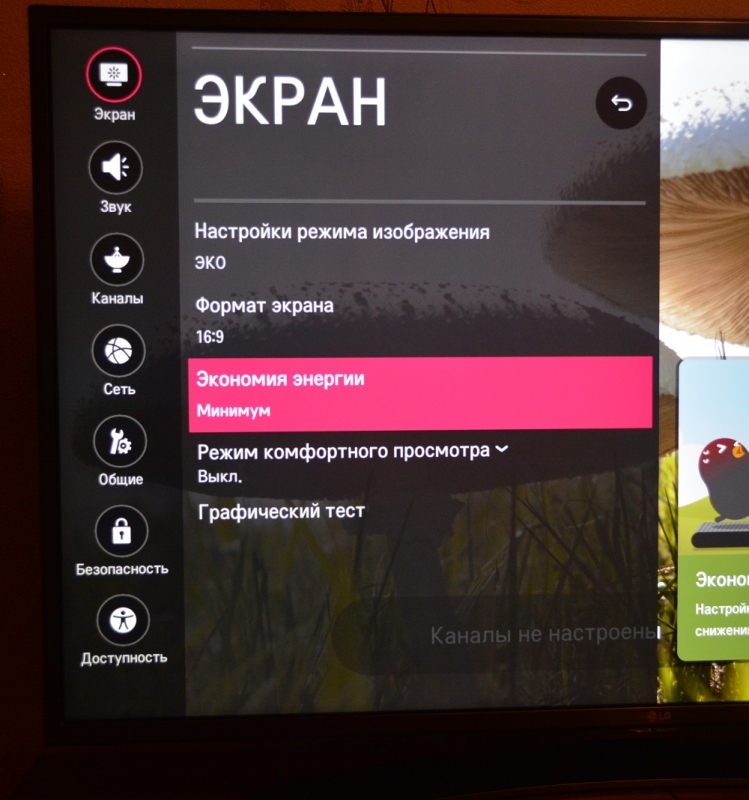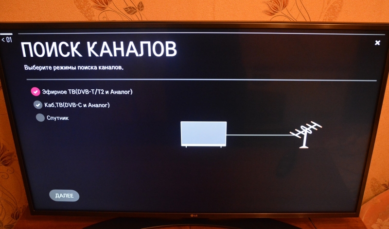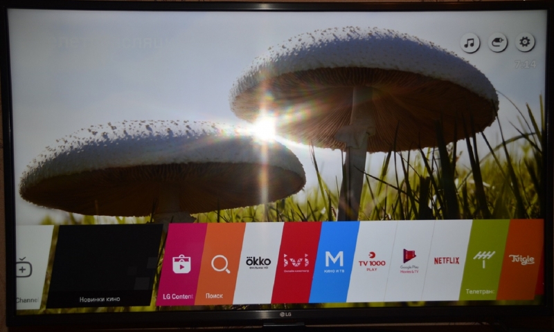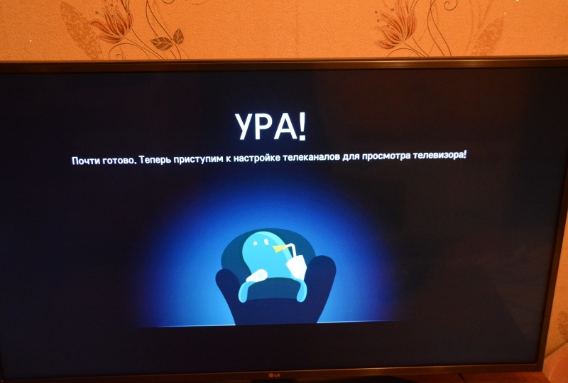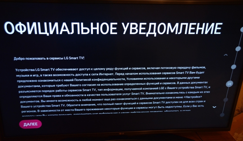 Первое включениеДля первичной настройки я собрал телевизор на ножке. Первое включение прошло довольно-таки быстро. Секунд пять-шесть висел логотип LG, потом примерно столько же - логотип webOS и включился экран, предлагающий настроить телевизор "под себя".