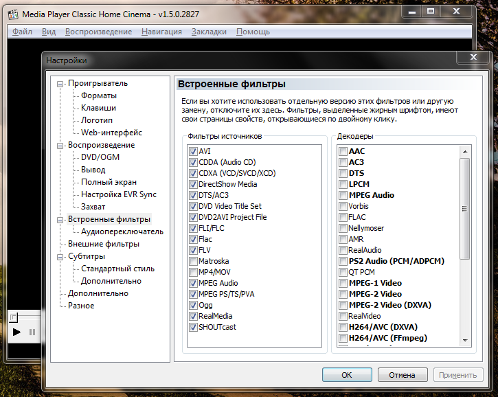 - В настройках идем в раздел встроенные фильтры и отключаем все галки в разделе Декодеры: