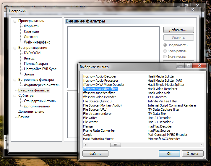 - Далее идем в раздел Внешние фильтры и жмем Добавить. Добавляем фильтр ffdShow raw Video Filter