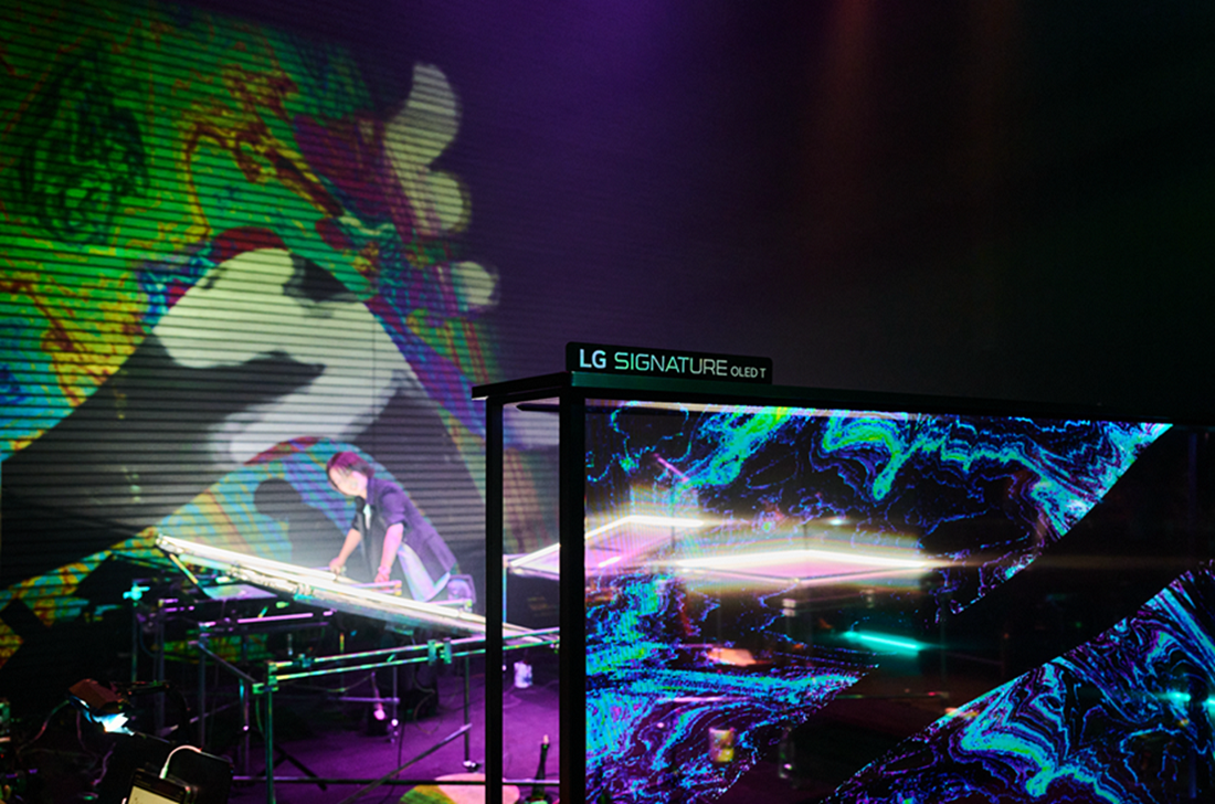 Во время выступления LG SIGNATURE OLED T стал динамичным цифровым холстом. Визуальный художник Moon Hung использовал прозрачный OLED в сочетании с проекционным маппингом и интерактивным звуковым оформлением. Визуальные эффекты (например, цифровая каллиграфия, состоящая из более чем двух миллионов элементов) казались парящими в воздухе.