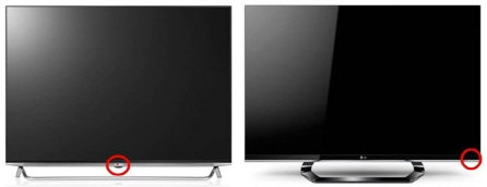 Вид и место расположения индикатора режима ожидания варьируется в зависимости от модели. Логотип LG или красный светодиод находятся в центре или в правом нижнем углу экрана.