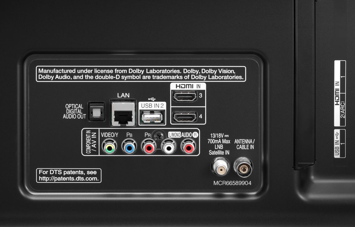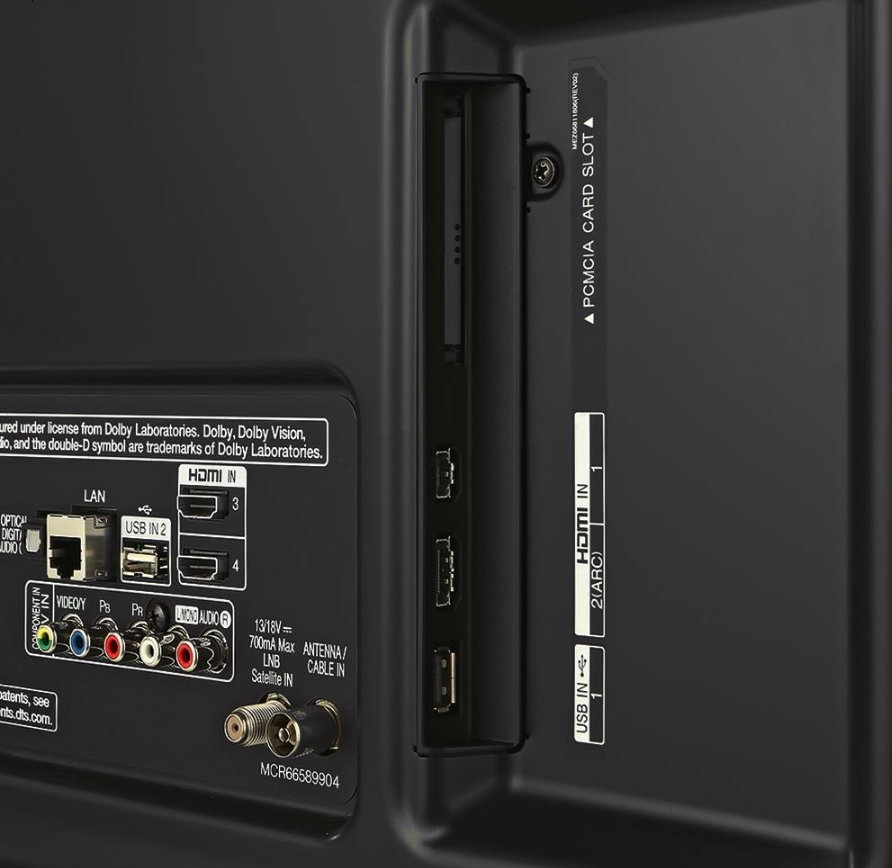 Задняя панель телевизора LG UJ670V оснащена следующими интерфейсами: два входа HDMI, 2 антенных (спутник/кабель) входа, компонентные входы по видео/аудио и по одному порту LAN (со скоростью 100 Мбит/сек) и USB (версии 2.0). Что касается аудио, то на этой же панели расположен только оптический аудиовыход, а стерео выход для наушников и выход аудио RCA (тюльпан) на два канала, как в моделях 2016 года, отсутствуют.