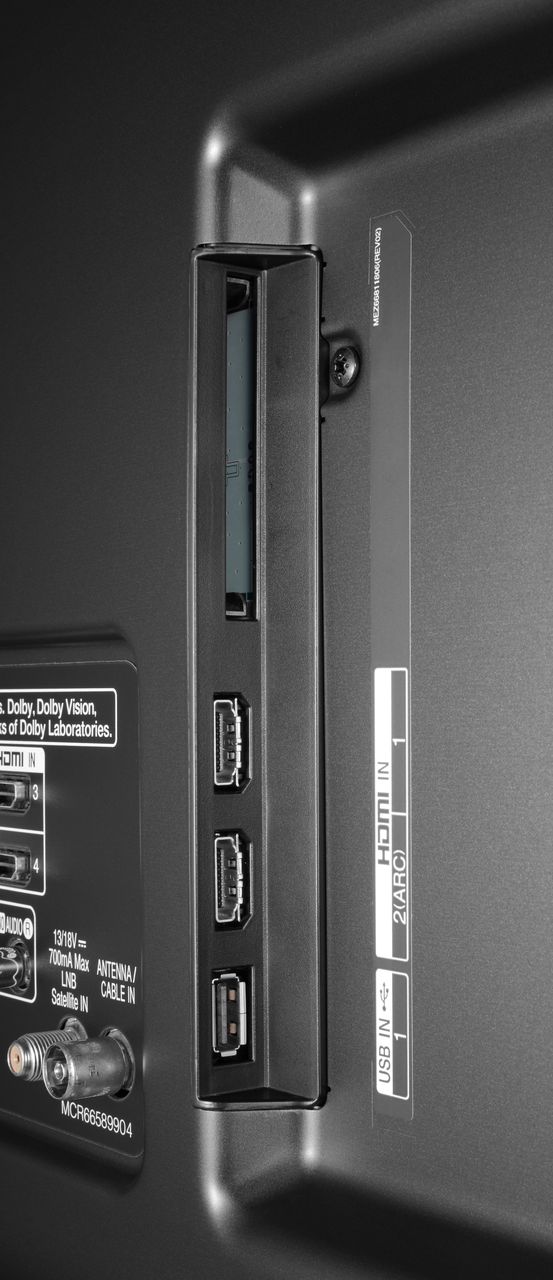 Боковая панель оснащена одним HDMI (ARC) входом, одном разъемом USB 2.0 и слотом условного доступа CI. Кроме того на борту имеется встроенный Wi-Fi модуль (с поддержкой стандартов 802.11a, 802.11b, 802.11g, 802.11n, 802.11n 5 ГГц, 802.11ac, Wi-Fi Direct).