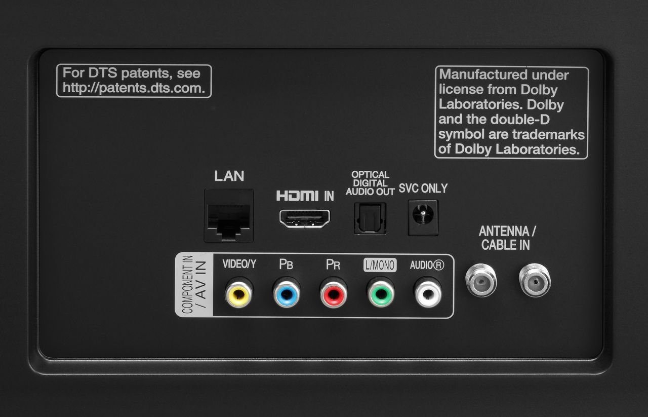 Задняя панель телевизора LG UJ635V оснащена следующими интерфейсами: один вход HDMI, 2 антенных входа, компонентные входы по видео/аудио и один сетевой порт LAN (со скоростью 100 Мбит/сек). Что касается аудио, то на этой же панели расположен только оптический аудиовыход. Стерео-выход для наушников и выход аудио RCA на два канала, как это было в моделях 2016 года, отсутствуют.