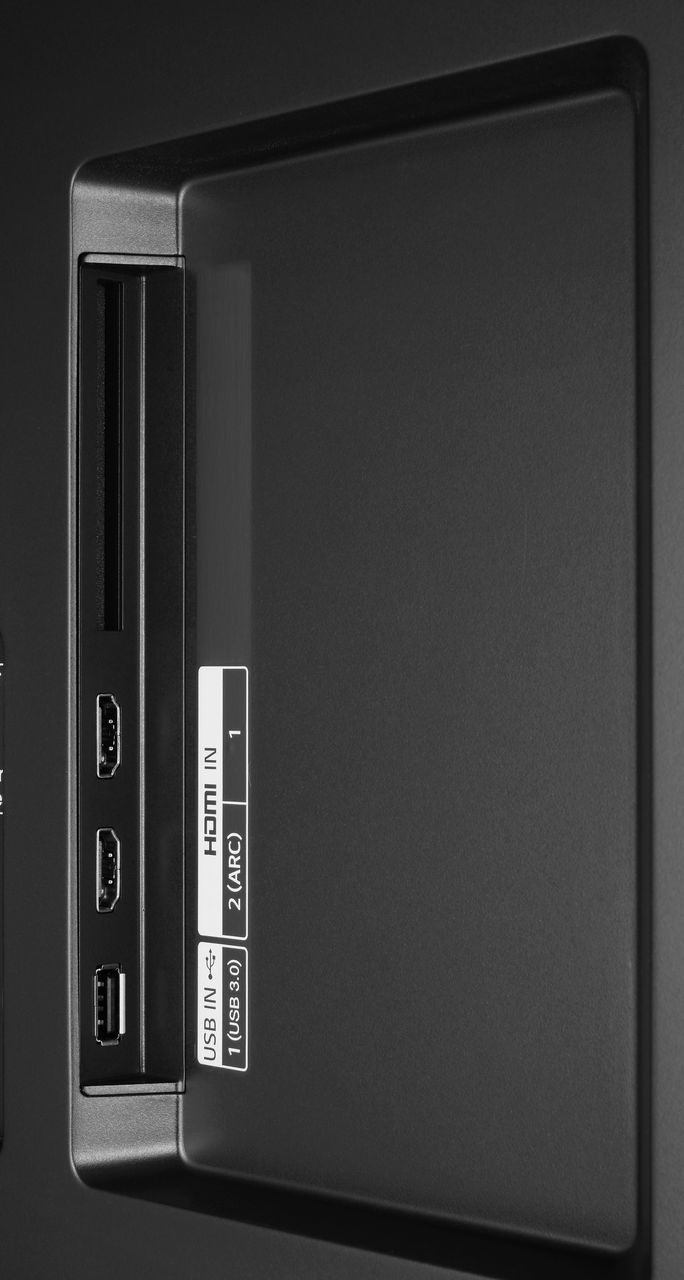 Боковая панель оснащена двумя HDMI входами (один из которых совместим с ARC) и одним разъемом USB 3.0. Как уже упоминалось, слот условного доступа CI в этой модели отсутствует. Кроме того на борту имеется встроенный Wi-Fi модуль (с поддержкой стандартов 802.11a, 802.11b, 802.11g, 802.11n, 802.11n 5 ГГц, 802.11ac, Wi-Fi Direct).