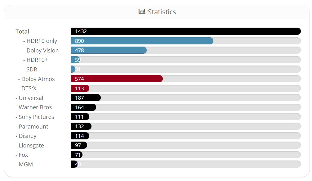 1432 фильма в формате 4K Ultra HD Blu-ray, в том числе 478 фильмов в формате Dolby Vision и 59 фильмов в формате HDR10+