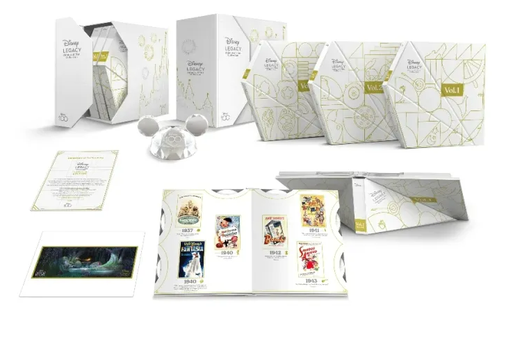 Набор украшен оригинальными плакатами и цифровыми кодами для каждого фильма, а также литографией из будущего полнометражного фильма Диснея «Желание», сертификатом подлинности и хрустальными ушками Микки Мауса с выгравированным логотипом «100 Дисней». Коллекция ограниченного выпуска поступит в продажу 14 ноября, а предварительные заказы на Walmart.com начнутся 18 сентября. Розничная цена составит 1500 долларов.
