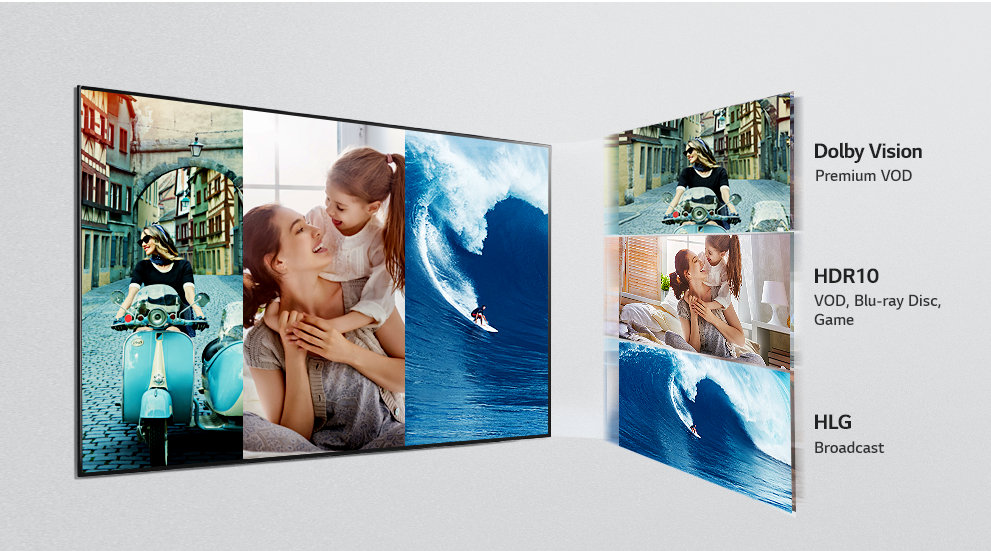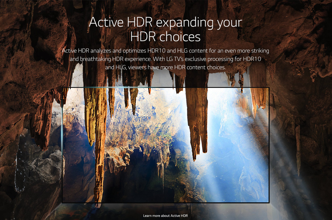 LG уверяет, что универсальность поддержки HDR с новой функцией "HDR Effect" намного увеличит качество SDR контента. С помощью функции HDR Effect обработка изображения SDR происходит покадрово и улучшает яркость в конкретных областях картинки, повышает коэффициент контрастности и создает более точные изображения.